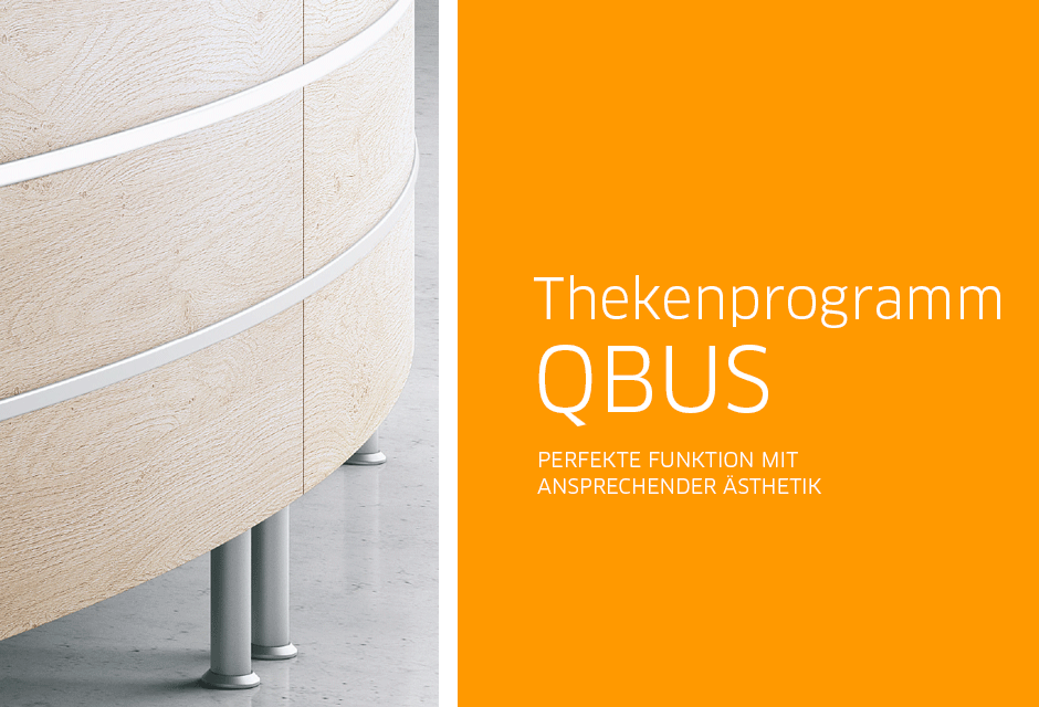 Die Korpusse aus Holz stehen auf filigranen Metallfüßen, die auch Thekenanlagen in größeren Abwicklungen eine optische Leichtigkeit geben. In der Front schaffen drei eingearbeitete Lisenen eine gegliederte optische Klarheit und prägen den Charakter der QBUS Counter.